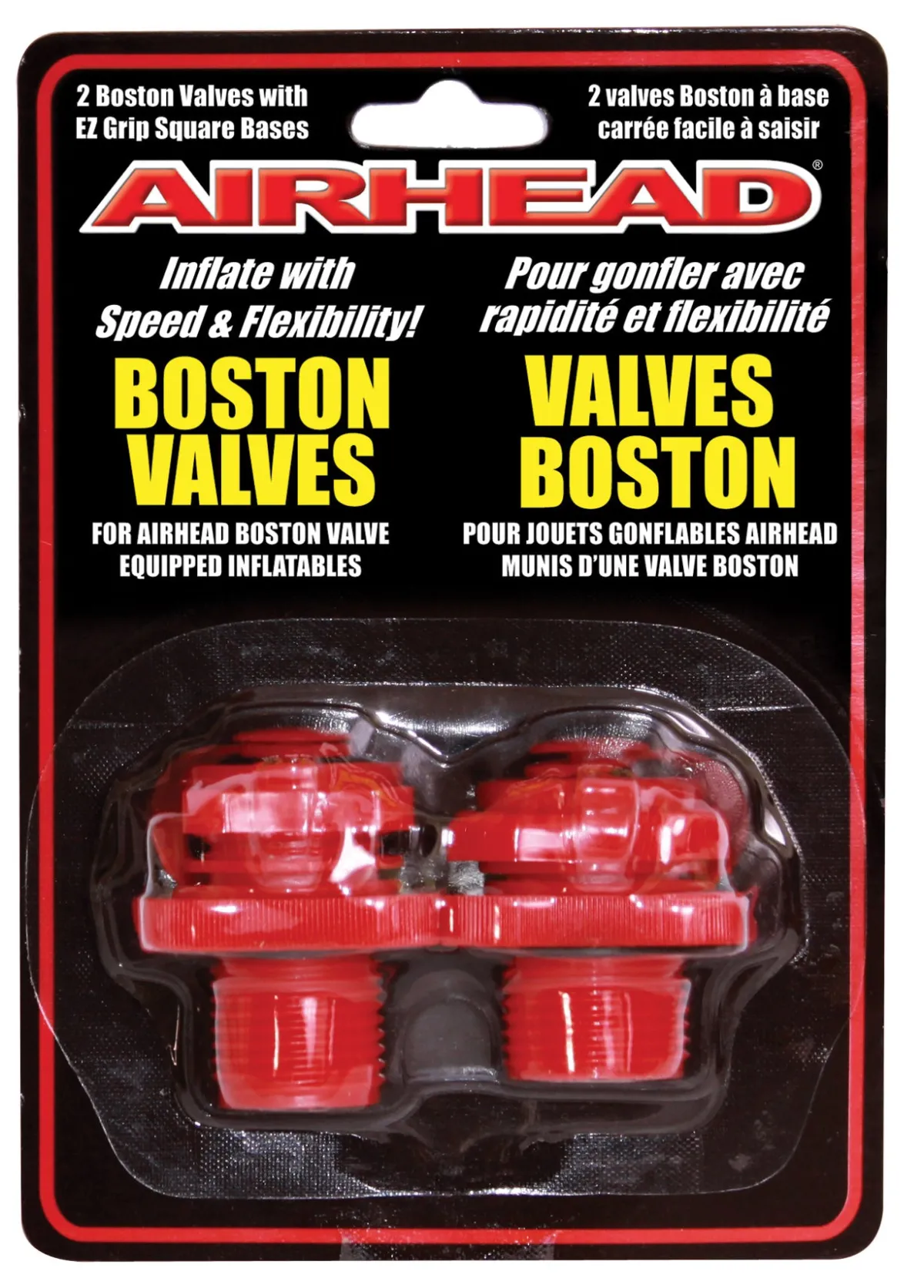 This pack of Boston Valves includes two valves that will fit all Airhead Boston Valve Equipped Inflatables. The square bases are much easier to turn than round bases, especially with wet hands. Bright red coloring makes the Boston valve adapter easy to find.