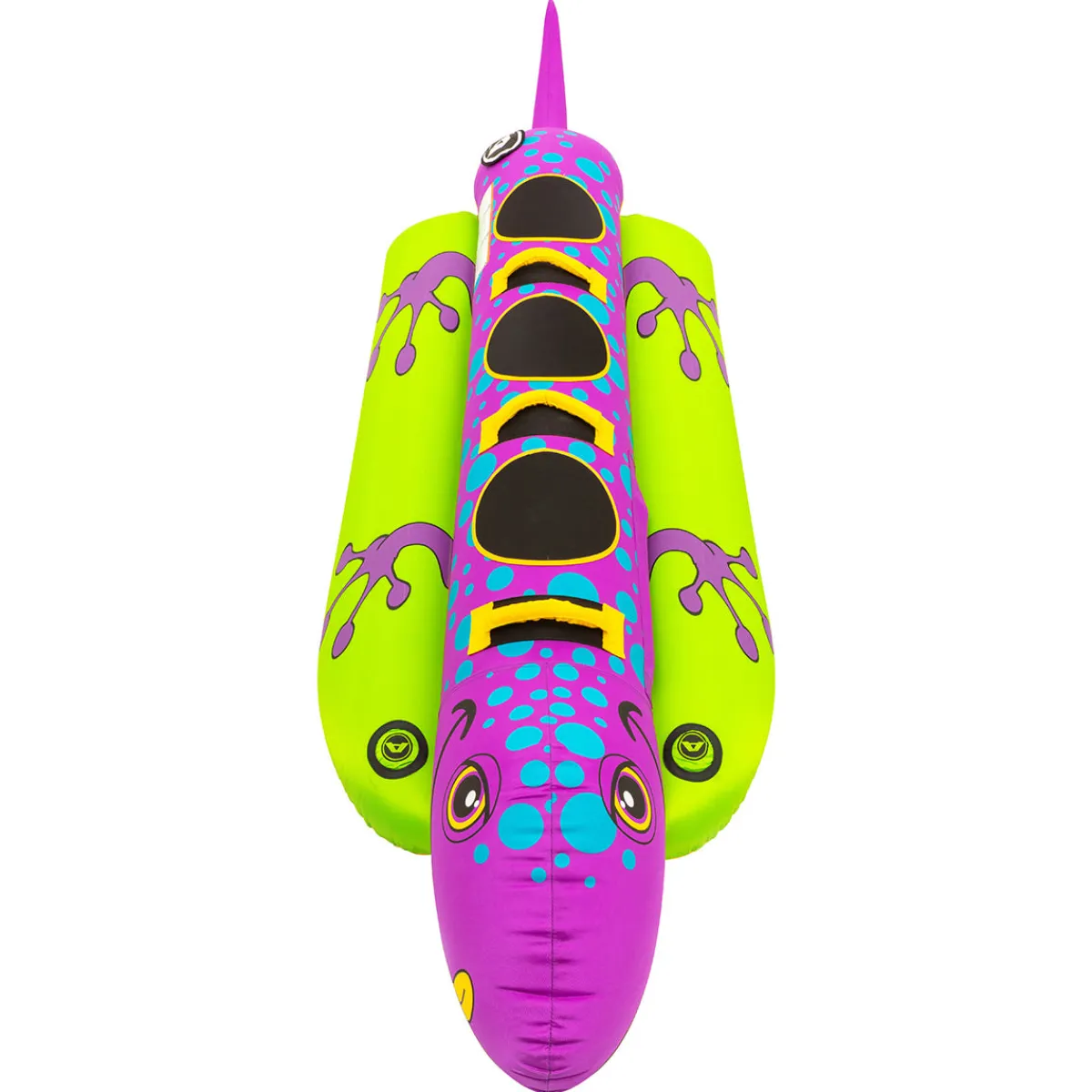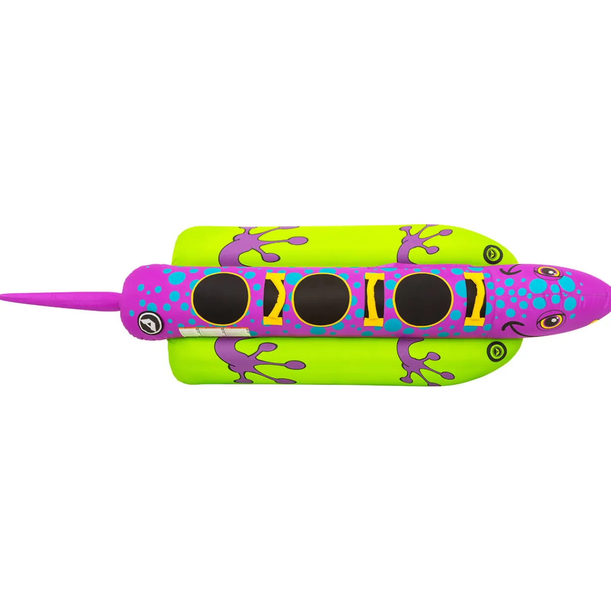 Sneak and slide along the water’s surface in our Salamander inflatable towable for boating. This bright and vibrant 3 person towable tube has room for three young riders, or one adult and two children. The comfortable foam padding makes the ride smooth, and the Patented Speed Safety Valve will inflate and deflate your tube quickly.