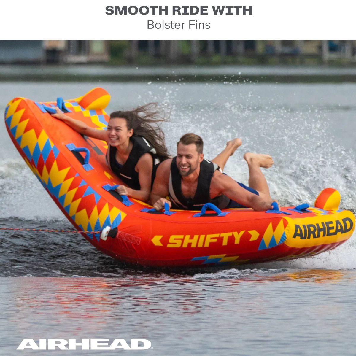 Redefine the towable experience with the Shifty 2-Rider Towable Tube. The Shifty 2 person inflatable towable tube features an innovative shape V shape. As you go out on the whip, lean into turns to bring the side of the tube down for a whole new experience. Tipping back and forth makes this a whole new way to enjoy summer days out on the lake.