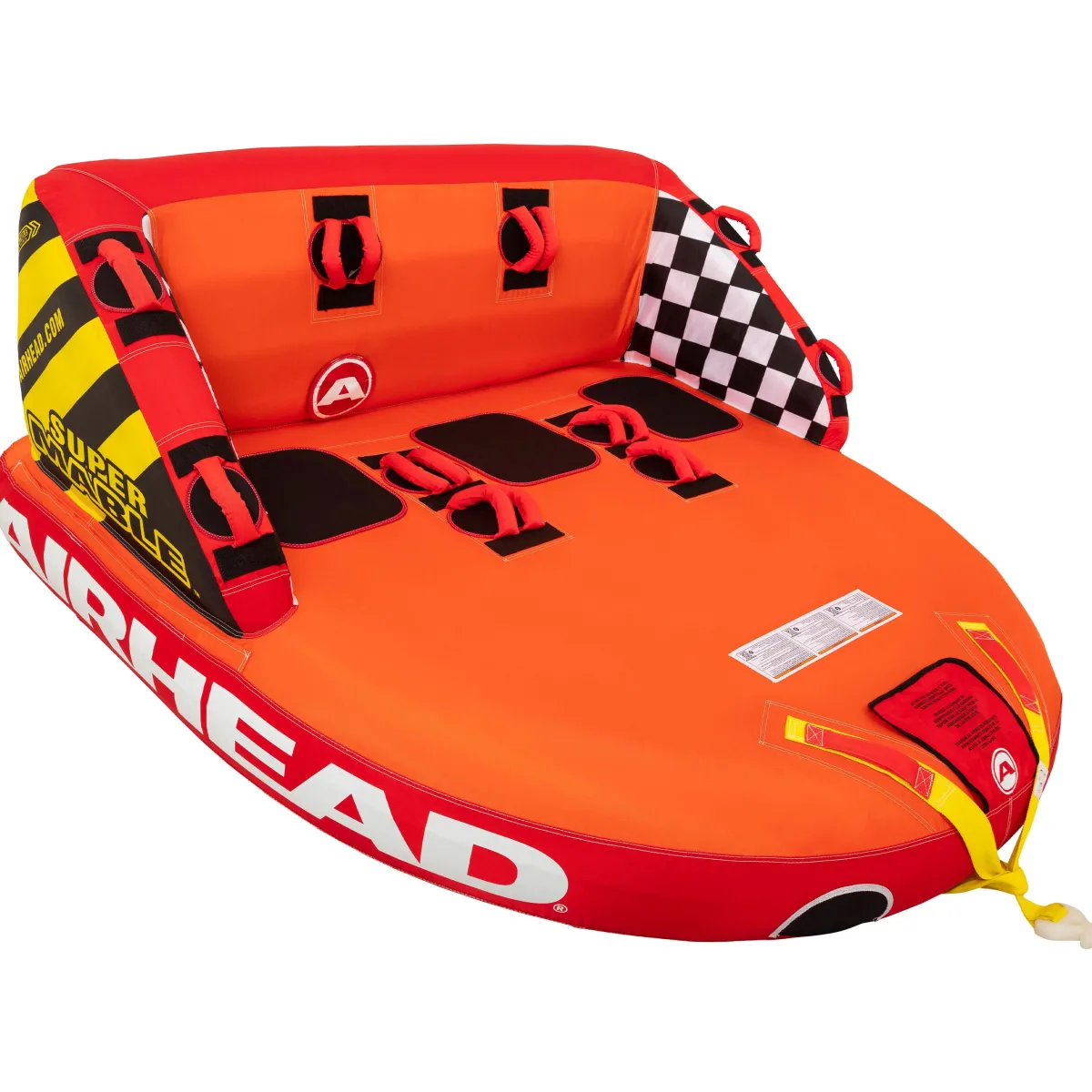 Airhead Super Mable is a 3 person towable tube that adds even more to the design we all know and adore. Discover all the classic features that Airhead tube lovers expect from the Big Mable—including a supportive backrest, top-notch safety features, foam seating pads, and dual tow points. This chariot-style towable tube holds up to three riders, making it perfect for family outings.