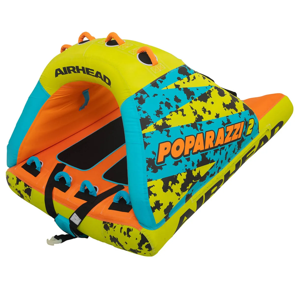 This Airhead Poparazzi 2 is a 2 person towable tube that wants to be seen. With a roof-like circle shape and a rocker bottom, taking this boat towable out on the lake is guaranteed to turn heads.